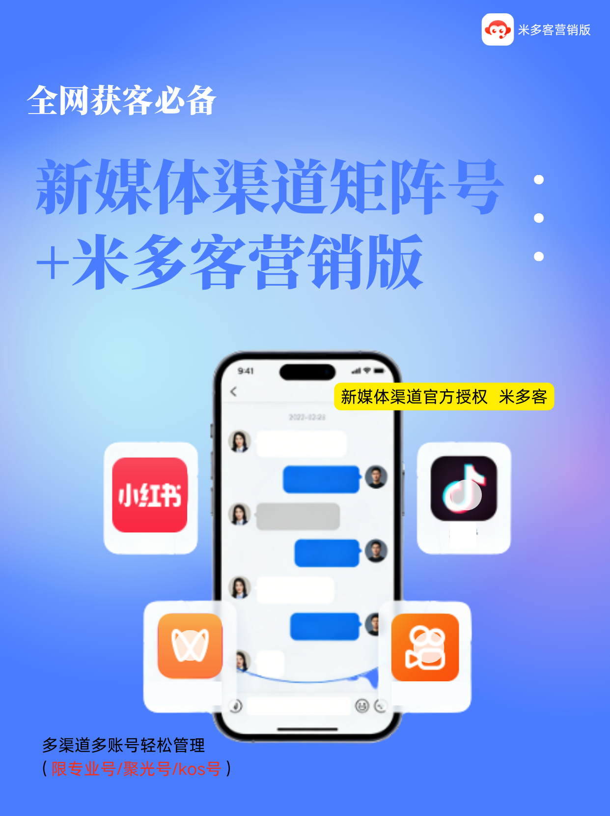 米多客深度整合抖音、小红书、视频号等新媒体渠道,实现一个后台统一管理所有咨询。所有来源的咨询自动汇聚,并带来源标签,客服可清晰识别各渠道效果,杜绝线索遗漏。