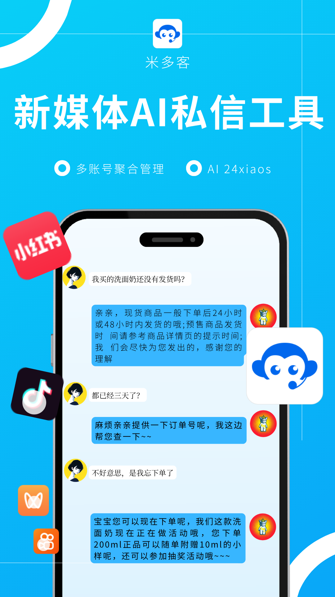 对于同时运营小红书、抖音、视频号等多个账号的团队来说,频繁切换App是一件极其消耗精力的事情。米多客支持50+账号同屏操作,将小红书专业号、KOS账号、抖音企业号等20余家主流平台的消息统一聚合在一个对话窗口中。客服无需来回切换,即可看到来自不同平台的客户咨询,系统自动识别消息来源账号,并支持按账号、按关键词智能分配会话给不同客服或AI处理,彻底解决多账号管理混乱的问题。