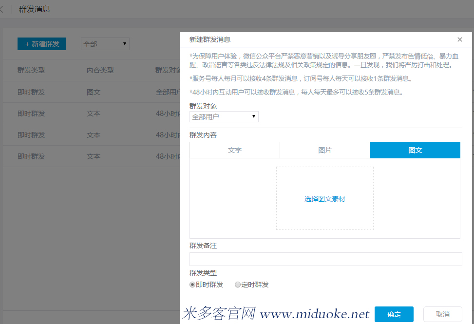 米多客微信公众号客服系统群发功能使用用途: