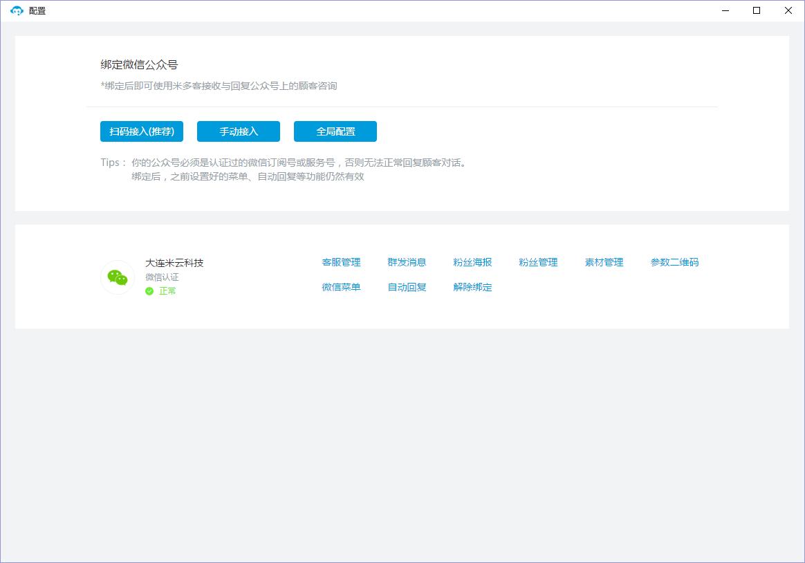 接入公众号客服系统的方式也非常简单,以米多客为例,在渠道中心-微信公众号,使用管理员微信号进行扫码授权即可接入使用。