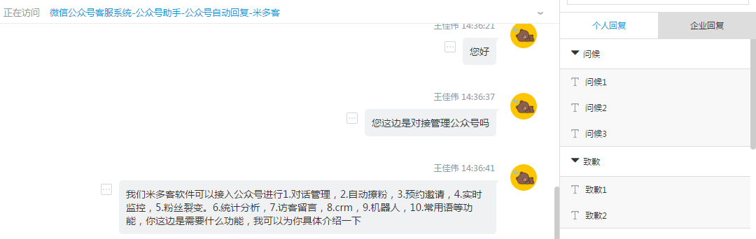 广州一家新媒体公司,旗下有五个公众号,经常因为微信公众平台的聊天记录会清空,二次对接客户的时候就非常麻烦,不知道该从何谈起,虽然平时也有记录,但是总归没有看历史聊天记录来的明白,经常出现一个问题多次向客户询问,搞得客户很是反感,极大地影响了客户的转化率。