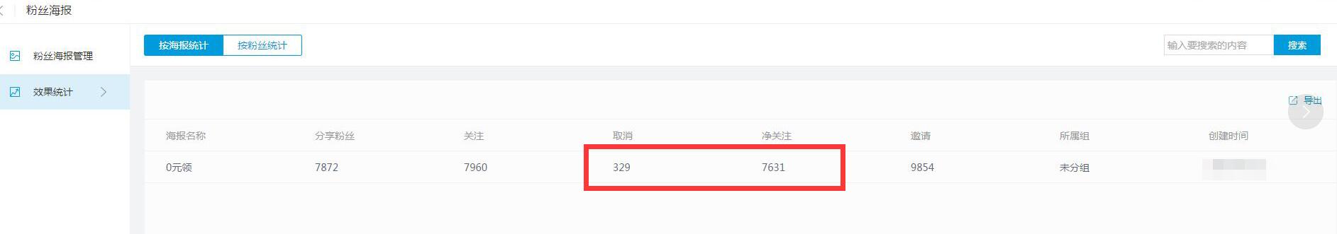 效果统计可以分为按海报统计和按粉丝统计两种,上面的就是按照粉丝进行的数据统计。按海报统计可以查看当前活动的分享粉丝数、关注数、取关数、净关注数,以确定把握活动的整体效果;按粉丝统计可以查看粉丝名称、二维码个数、关注数、取关数和净关注数,按粉丝贡献数,以判断参与活动粉丝的完成情况。上述活动中,粉丝留存率95.87%,这个数据是非常可以的。