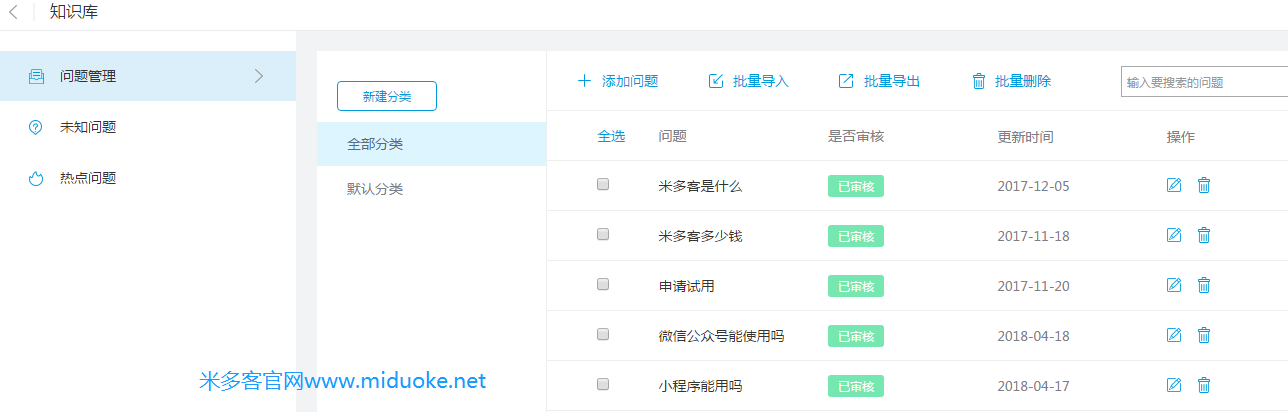 可针对常见问题整理进米多客知识库,编辑问题、答案、产品、功能等多种文本类型,客服遇到相应的问题时就能一键发送来解答。,即使是新客服,也可以很快上手,缩短培训时间。