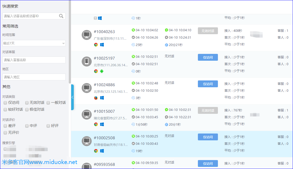 多客服多渠道同时接待,完全不需要担心回复不及时或者消息遗漏,因为可以事先在米多客客服中设置好分配规则,例如a公众号分给客服1,b公众号分给客服2,ab不在线时分给客服3,防止有的粉丝没人接待,有的粉丝被抢着接待等情况发生。