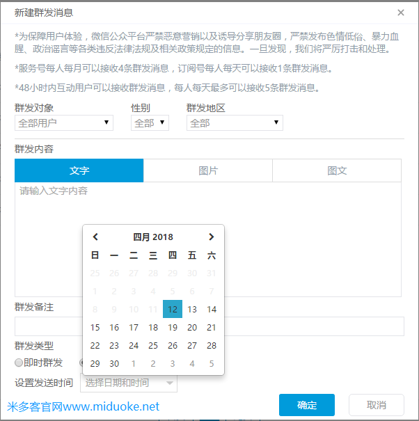 通过米多客软件的定时发送功能,可提前设置好发送时间和内容,当时间一到就会自动发布出去,如消息通知、客户关怀、新卡种推荐、新型理财产品推荐等。“尊敬的客户,您的刷卡免息期截至是本月25号,请及时缴纳费用”。