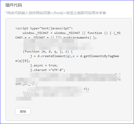 进入米多客【设置中心】-【渠道接入】,选择【网页插件】,可以看到一段插件代码,将此代码复制嵌入H5界面的</body>标签之前即可轻松接入米多客啦。