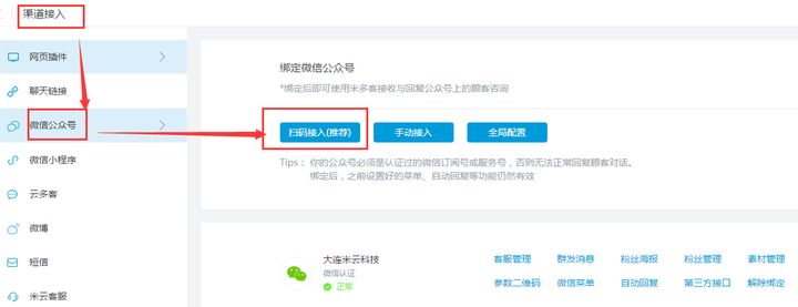 进入米多客【渠道接入】-【微信公众号】,点击扫码接入,使用公众号管理员微信账号进行扫码,即可轻松完成绑定。