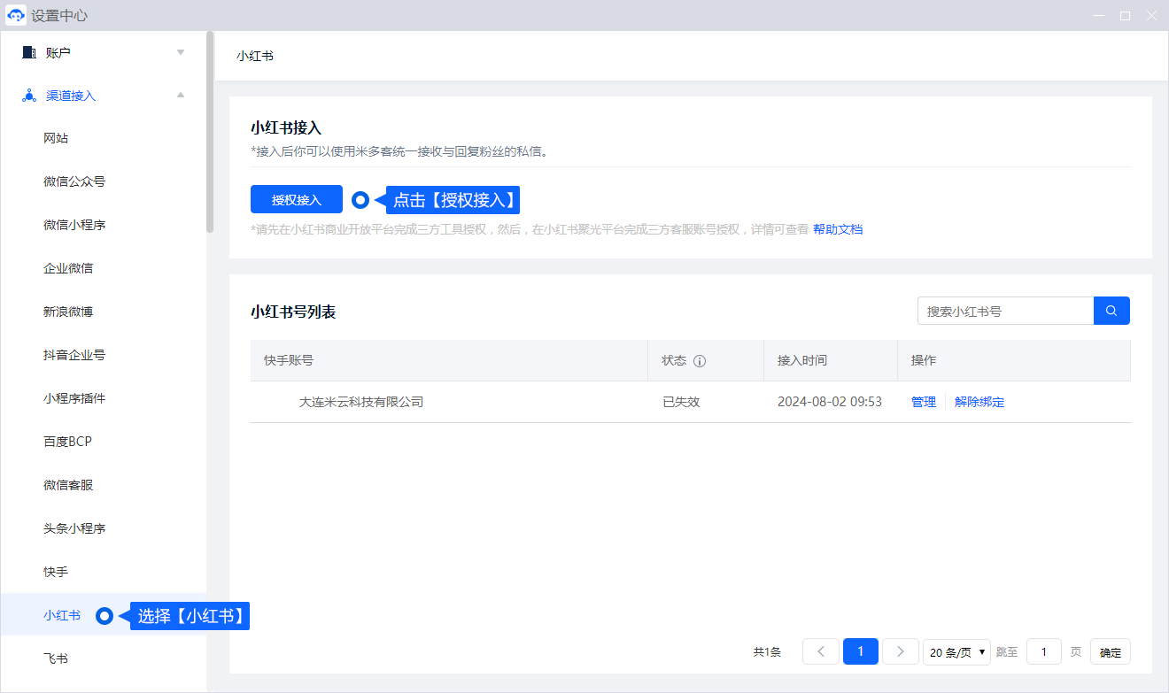 第二步:登陆米多客客服系统,依次点击「设置中心-小红书」,并点击【授权接入】。