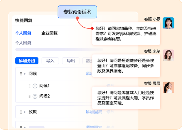 预设常用话术库,对于常见问题,直接点击发送,实现“秒回”级别的响应速度,极大提升用户好感度和转化率。