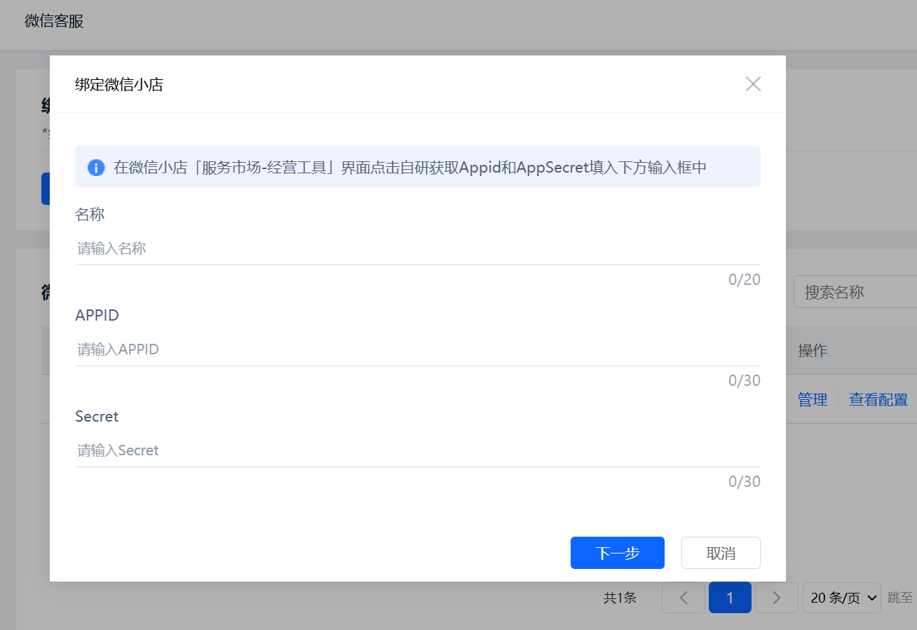 如需团队协作或更强大功能,在「企业信息」页面获取【企业简称】与【企业ID】信息,回填至米多客营销版 【绑定微信小店】弹窗页面,填写完成后点击【下一步】。