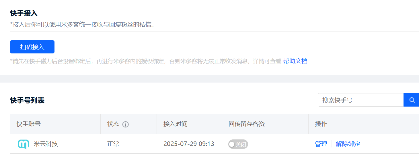 米多客的接入非常简单,授权绑定你的快手账号后,根据引导设置好回复规则就可以了。首次使用会有清晰的指引,即使不太懂技术也能轻松上手。