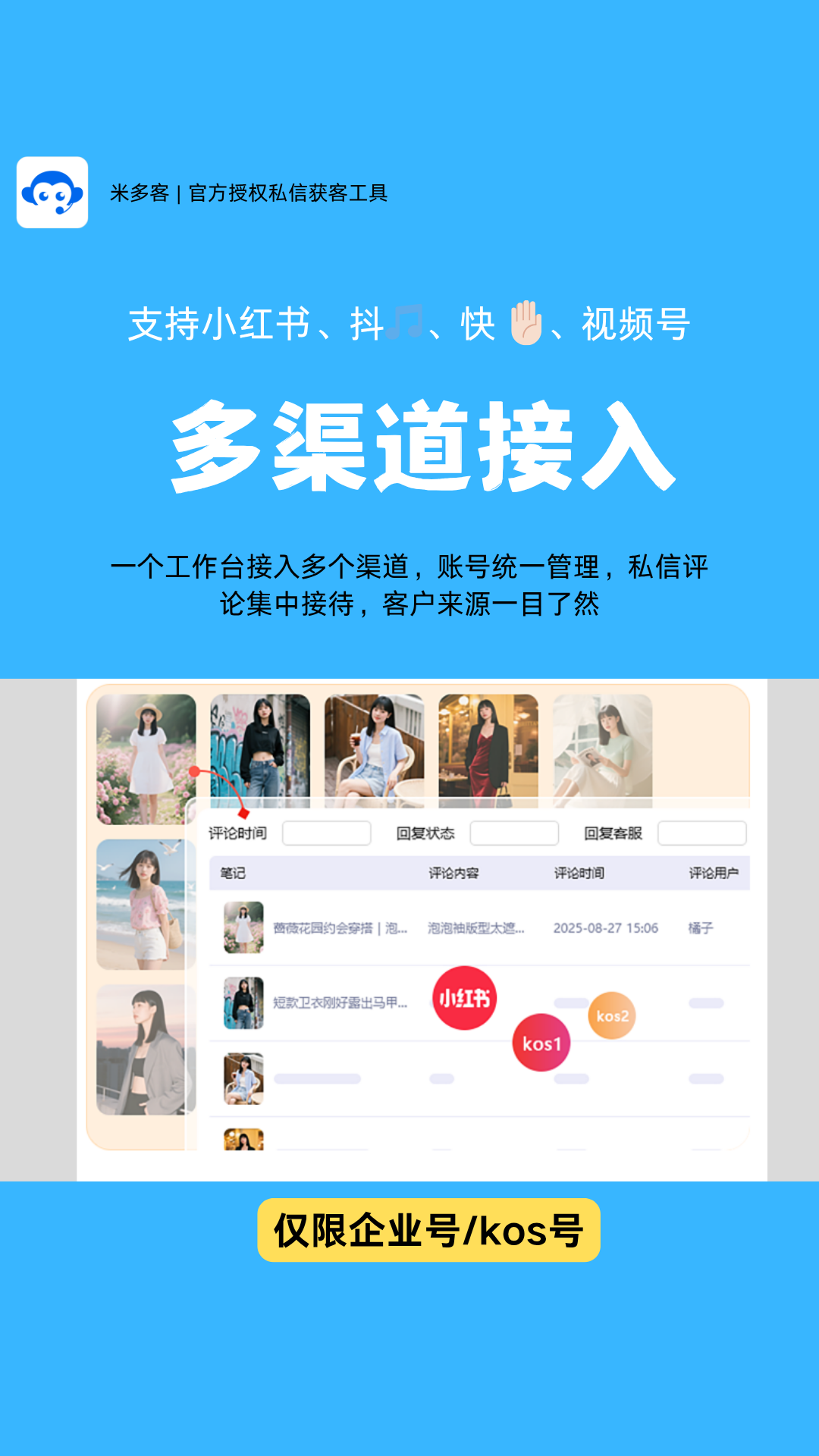 对于同时运营小红书、抖音、视频号等多个账号的团队来说,频繁切换App是一件极其消耗精力的事情。米多客支持50+账号同屏操作,将小红书专业号、KOS账号、抖音企业号等20余家主流平台的消息统一聚合在一个对话窗口中。客服无需来回切换,即可看到来自不同平台的客户咨询,系统自动识别消息来源账号,并支持按账号、按关键词智能分配会话给不同客服或AI处理,彻底解决多账号管理混乱的问题。
