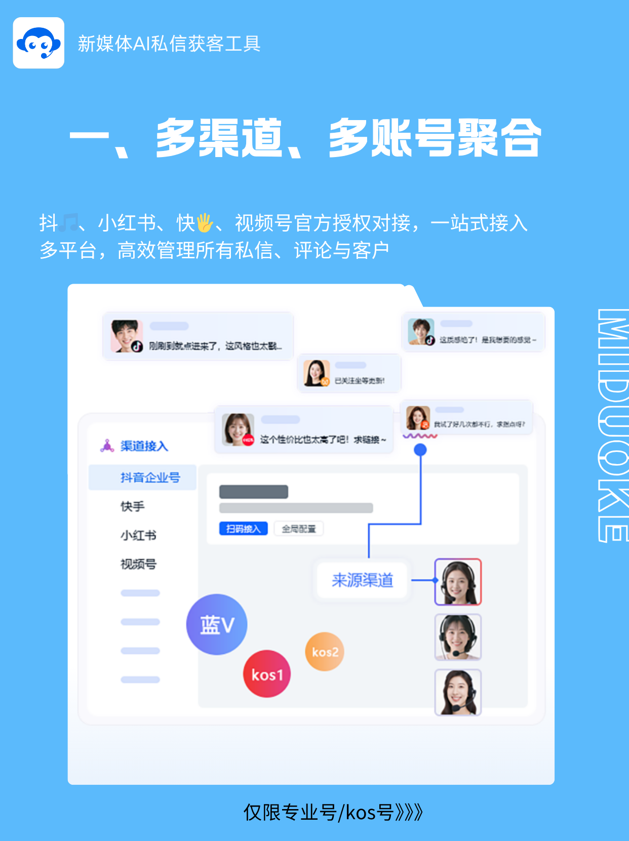 全渠道统一管理,告别切换混乱。 米多客支持抖音、小红书、快手、视频号等超过20家主流平台的一站式接入,在一个工作台内即可处理所有私信和评论。系统采用智能分配机制,按账号或关键词将会话自动分配给不同客服或AI处理,即使客服掉线,对话也会无缝转接,保证零漏接、零中断。