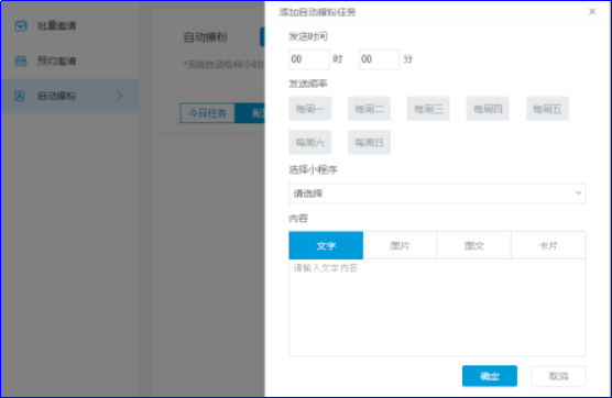 批量邀请可以对48小时内互动用户进行批量消息推送;预约邀请支持定时给某一用户发送编辑好的内容,成交用户可以促成多次成交;自动撩粉功能可以设置推送频率对小程序客户进行消息群发。