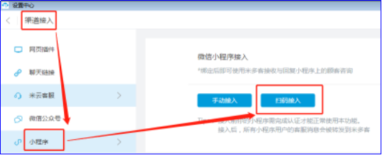 打开米多客小程序客服系统,在后台【设置中心】-【渠道接入】-【小程序】,选择扫码接入,使用管理员个人微信号直接扫描即可轻松开启客服功能。
