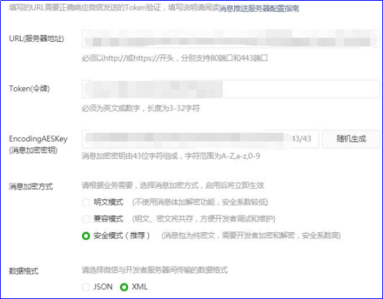 将米多客中生成的配置信息在小程序后台「设置」-「开发设置」-「消息推送」服务中进行配置并启用「消息推送」服务,其中「消息加密方式」应选择「安全模式」,「数据格式」应选择「XML」。