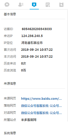 流量统计工具比在线客服系统更早诞生,但是网站主不可能实时去流量统计后台查看数据,有顾客来访我们也不知道,这也是推动在线客服系统诞生的一个原因。获取访客信息是在线客服系统的一项基本功能。当有访客打开网站后,客服系统就可以抓取访客的相关信息如IP、地区、来源、搜索引擎、搜索关键词、浏览器型号、操作系统型号、是否回头客等等。