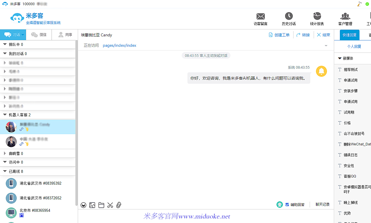 用户到访,米多客0秒接入,像QQ一样闪烁提醒客服人员进行接待。用户的问题第一时间得到了回复,自然会促进用户的购买意愿的提升。企业通过使用智能客服系统,可以有效提高转化率。