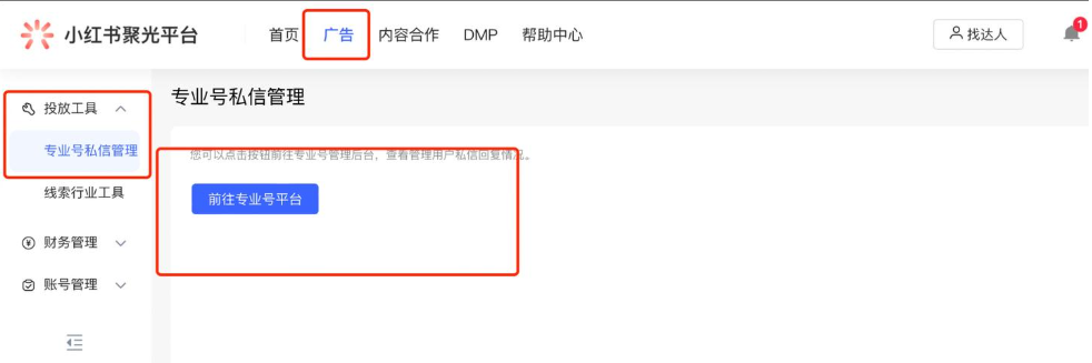 2.选中【广告】-【投放工具】-【专业号私信管理】-【前往专业号平台】