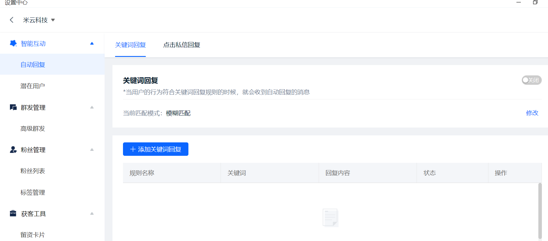 可以在米多客营销版后台,设置自动回复功能,包括关键词回复和点击私信回复。