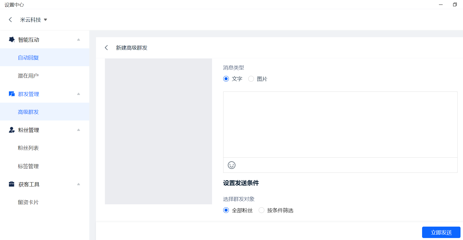 灵活选择对象: 支持对不同来源的用户进行分组群发,例如:对新关注的粉丝、有评论/点赞行为的用户、或从特定视频引流来的用户进行精准消息推送。