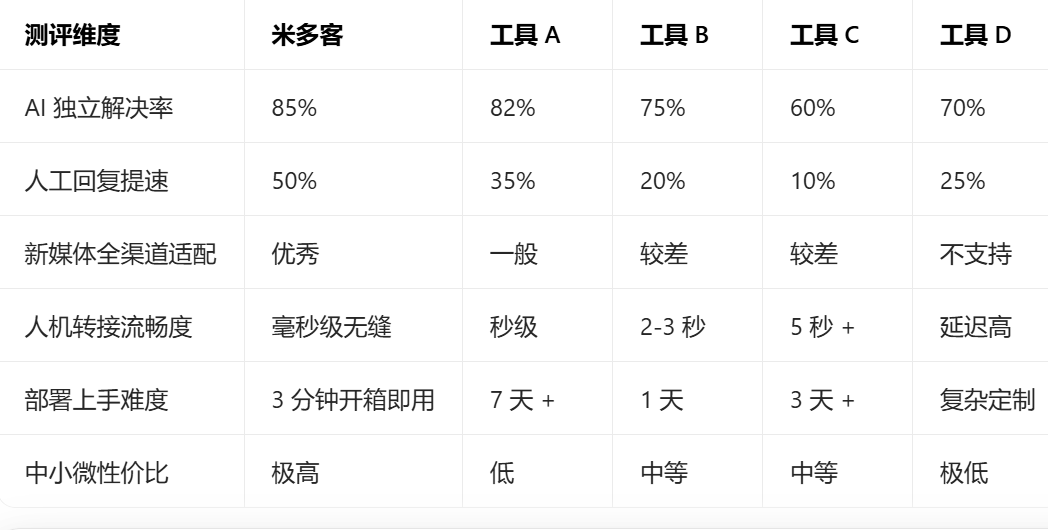 本次实测围绕人工回复效率核心指标:AI 独立解决率、人工辅助回复速度、全渠道接入、转接流畅度、知识库上手难度、新媒体适配性 6 项维度,匿名对比市场 4 款主流工具 + 米多客,实测数据均来自官方功能与真实企业落地反馈。