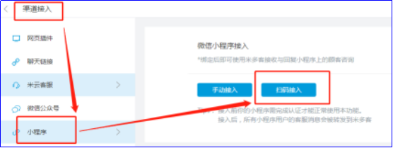 打开米多客小程序客服工具,在【设置中心】-【渠道接入】-【小程序】,选择扫码接入,使用管理员个人微信号直接扫描即可轻松完成绑定。