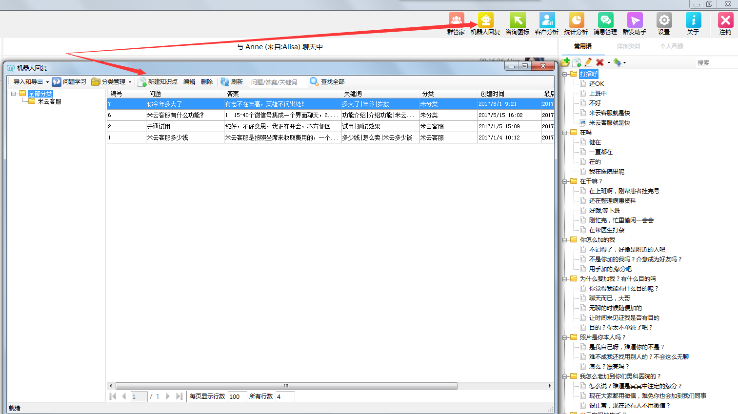 点击右上角【机器人回复】进入设置页面,选择分类管理可对话术进行分类,方便管理;点击新建知识点即可进入新建知识点窗口。