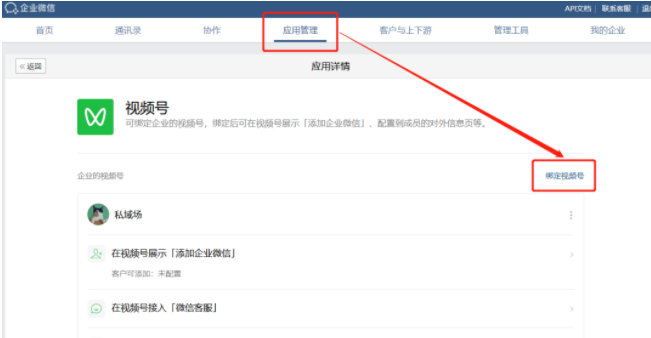 同时管理员还可以在企业微信管理后台的【应用管理】-【视频号】中进行绑定。