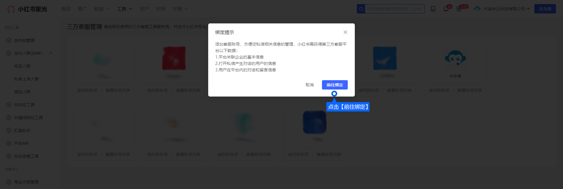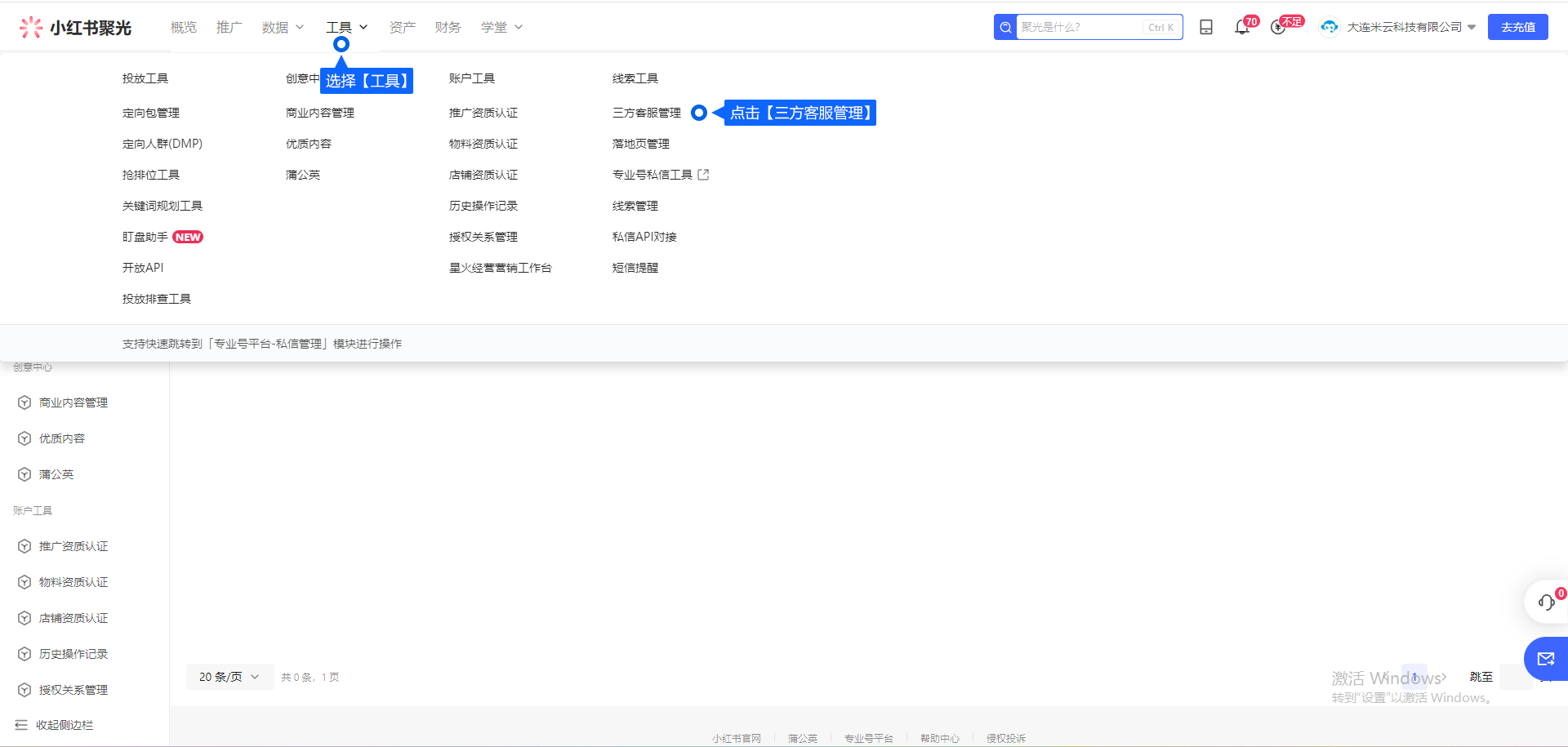 1.登陆小红书聚光平台,依次点击「工具-三方客服管理」