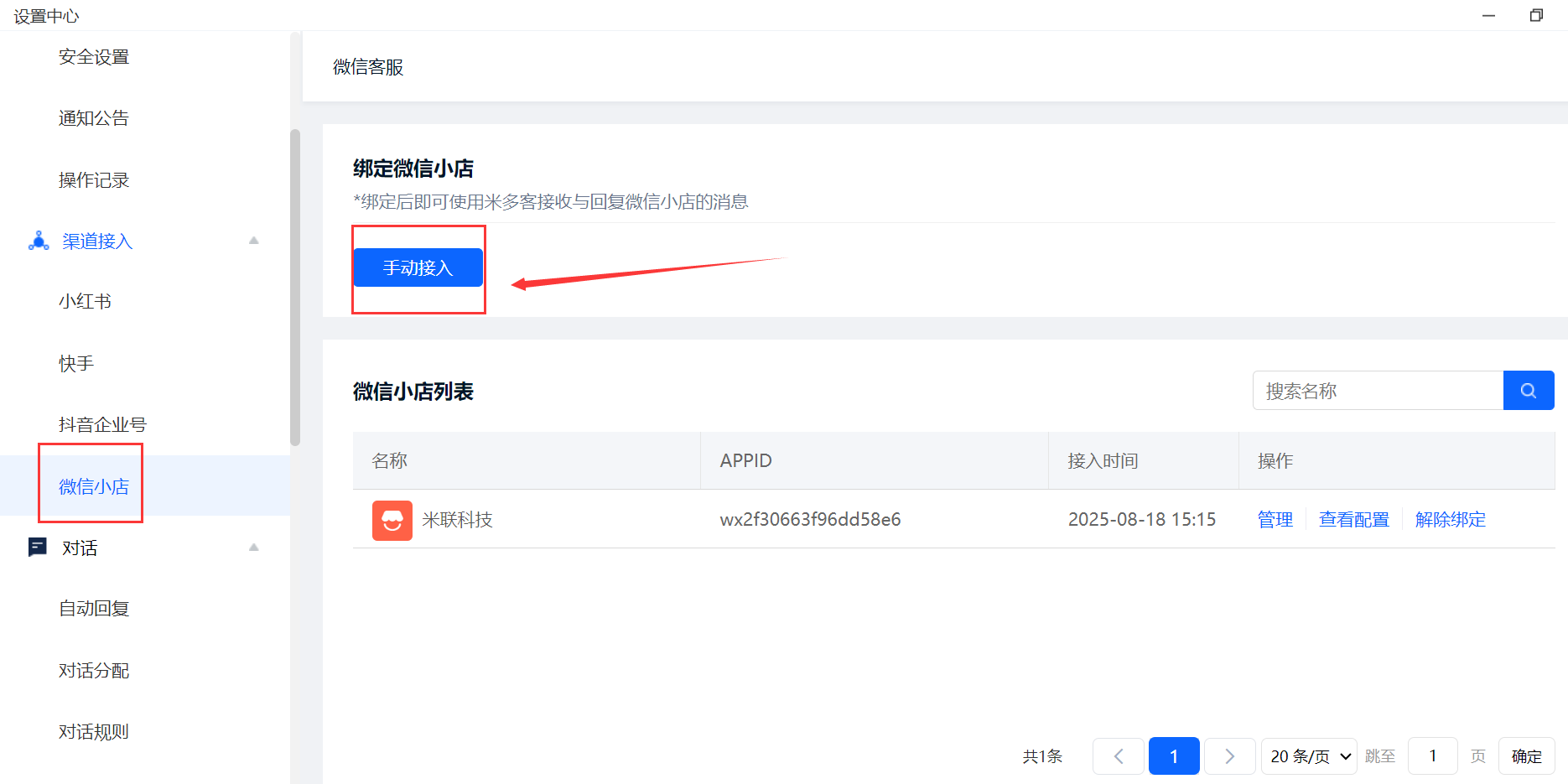 然后进入米多客营销版后台,【设置中心】-【渠道接入】找到视频号微信小店,点击【手动接入】按钮;