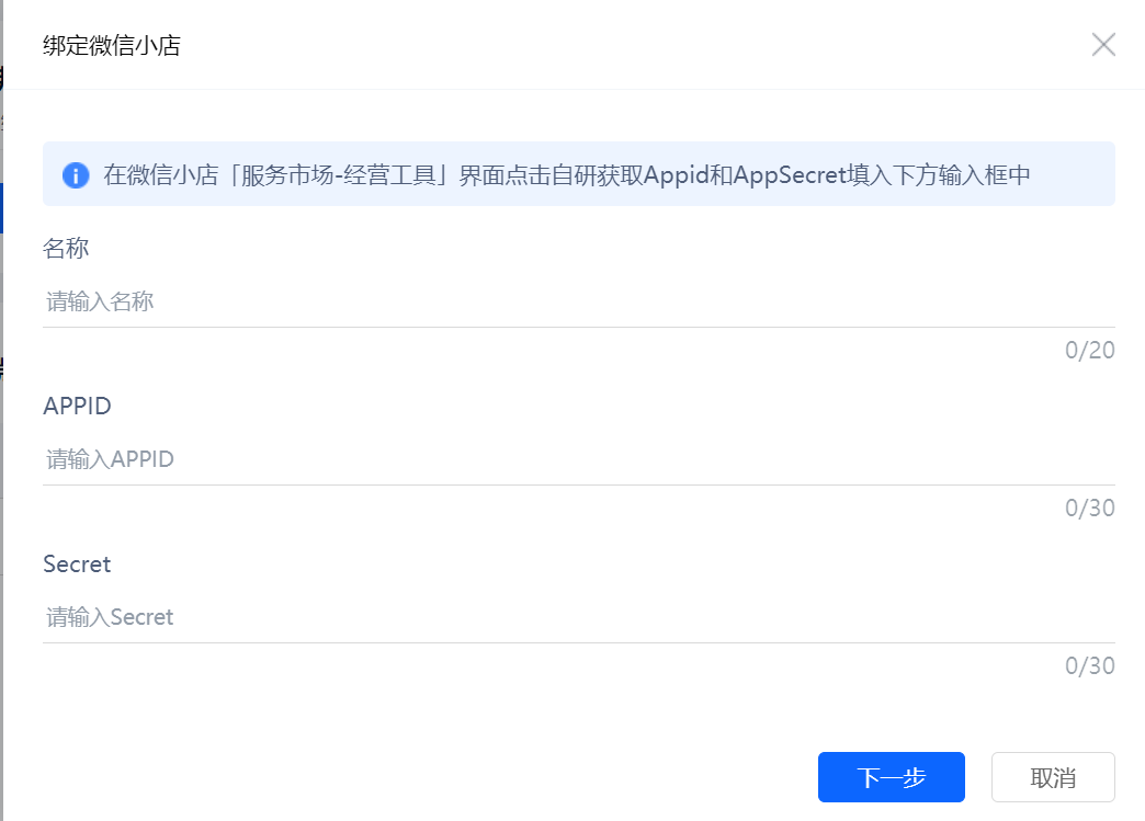 在微信小店「服务市场-经营工具」界面点击自研获取Appid和AppSecret填入下方输入框中;