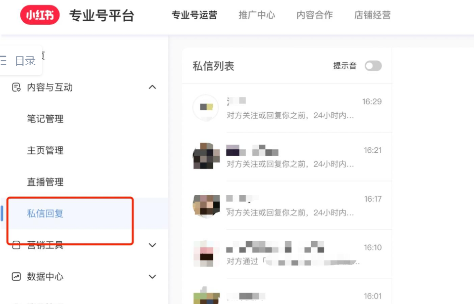 专业号后台里面就有【内容与互动】-【私信回复】,然后你就能看到你的私信列表,及时跟进及时回复了。