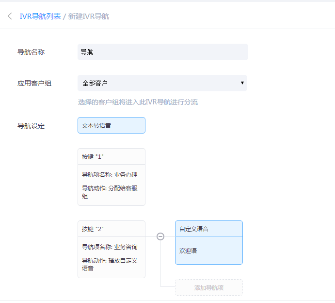 根据企业自身的情况,设定IVR语音导航,米多客云呼叫中心支持6级IVR语音导航,每一级可以设置12个按键的不同导航,企业可根据自身需求的不同,进行不同设置。