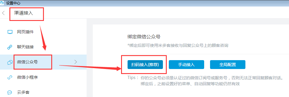 2. 接入微信公众号,使用管理员微信号扫码即可轻松完成;