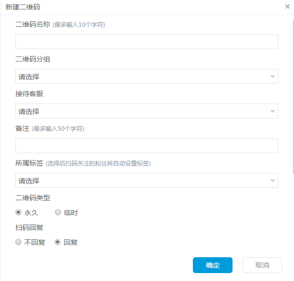 4. 在这里我们就可以填写参数二维码的信息,二维码名称,分组,还可以设置专属客服接待,比如工作人员A在朋友圈发的二维码只能是A接待,其他人无权接待;还可以设置扫这个码,粉丝关注自动回复对应内容。