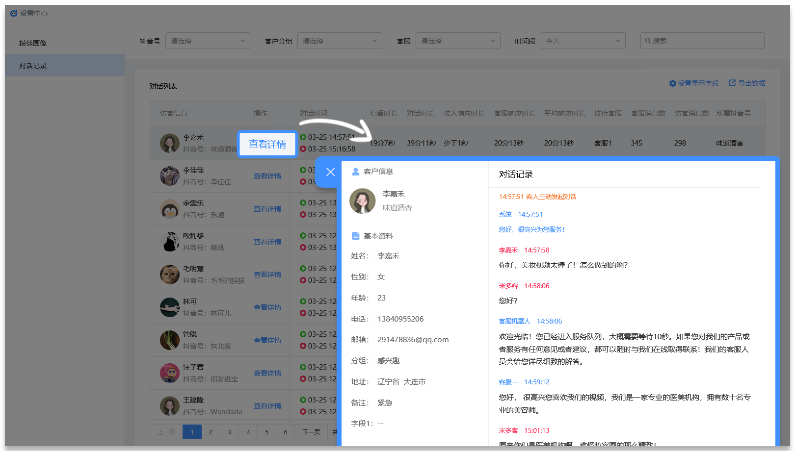 抖小助可以分时段地保存抖音客服的在线消息记录,并提供消息记录漫游服务,企业无需固定在本地电脑上查看记录信息,还可以通过系统的时间段查询、访客信息查询等功能快速找出目标记录,亦可通过导出记录功能下载到本地电脑上。
