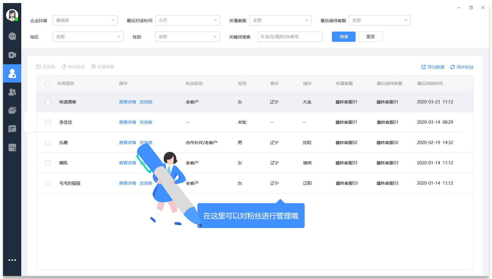 通过抖小助抖音客服系统可以为粉丝打标签,根据不同粉丝的需求进行标签分组管理,通过数据,精准定位粉丝。同时可以按标签选择粉丝进行精准群发消息,增加视频的播放量和关注量,同时可以转粉到其他渠道。