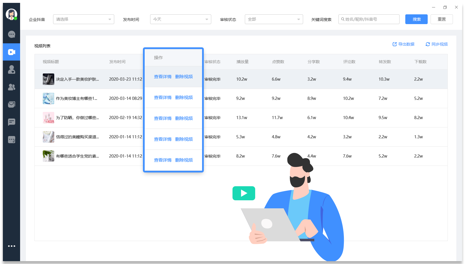 抖小助的数据分析包括视频数据与粉丝数据。可统计播放量、点赞数、分享数、评论数、转发数和下载数,支持导出数据,为抖音营销提供数据支持。对粉丝行为进行统计,通过粉丝流量贡献,判断视频质量。