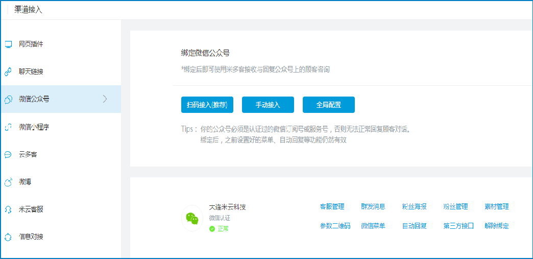 微信公众号怎么接入米多客客服功能?如果你的公众号是认证的,那么可以选择直接扫码接入,或者手动接入。推荐扫码接入,方便快捷,一键绑定。只要公众号是认证的,不拘于微信订阅号或服务号,都可以实时接收微信公众号后台的用户消息。