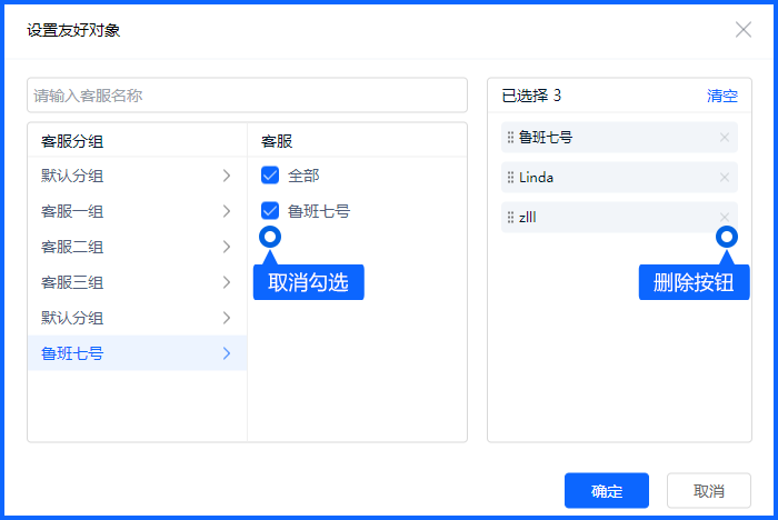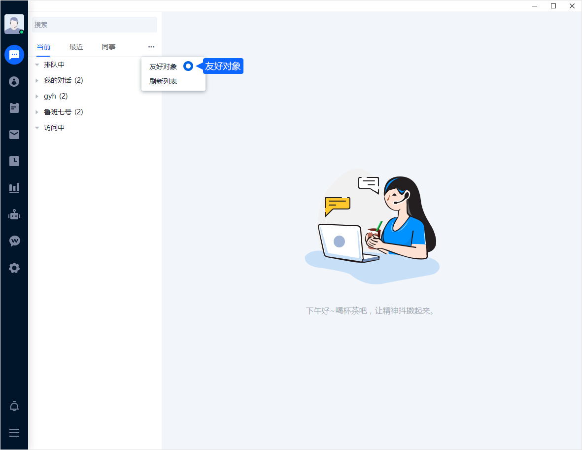 在对话列表中找到【更多】按钮选择【友好对象】,在设置界面勾选想要查看的客服聊天即可。