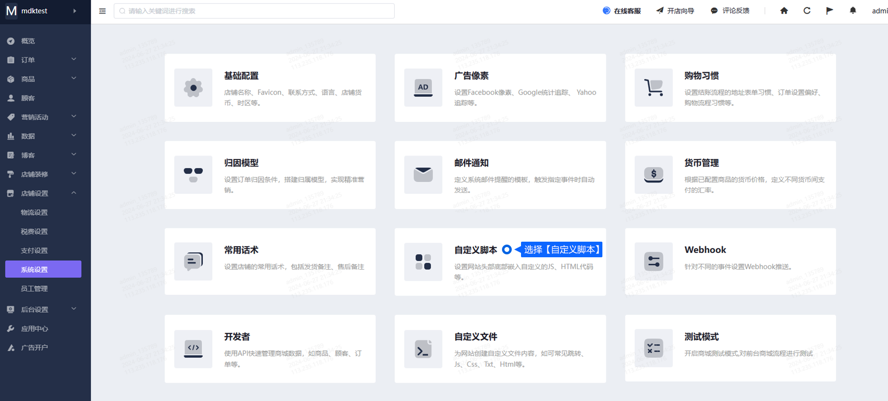 第二步:登录SHOPYY商店后台,登录后,在左侧菜单里选择【店铺设置】-【系统设置】-【自定义脚本】。