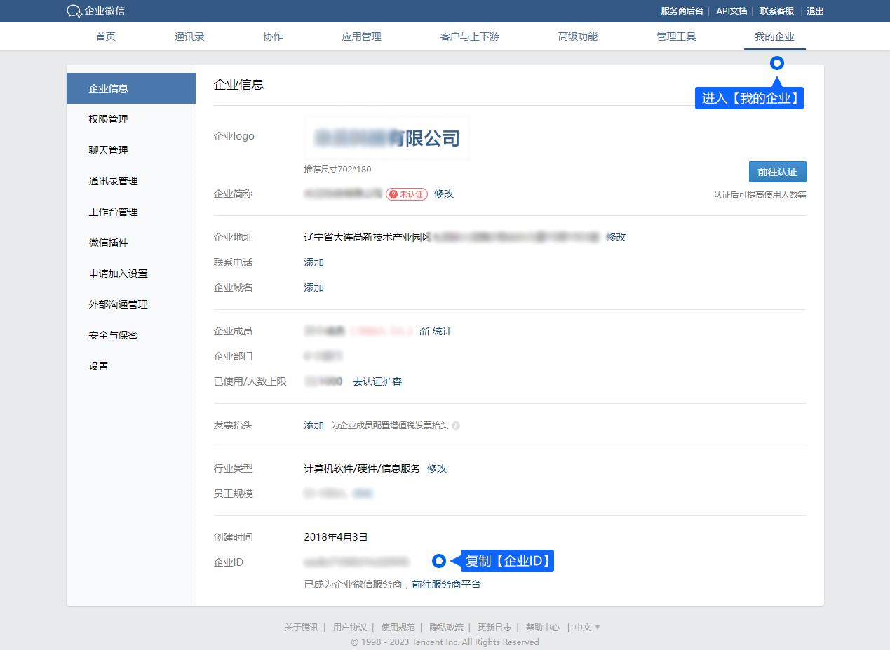首先登录企业微信https://work.weixin.qq.com/进入「我的企业 - 企业信息」页面中,获取【企业ID】并复制。