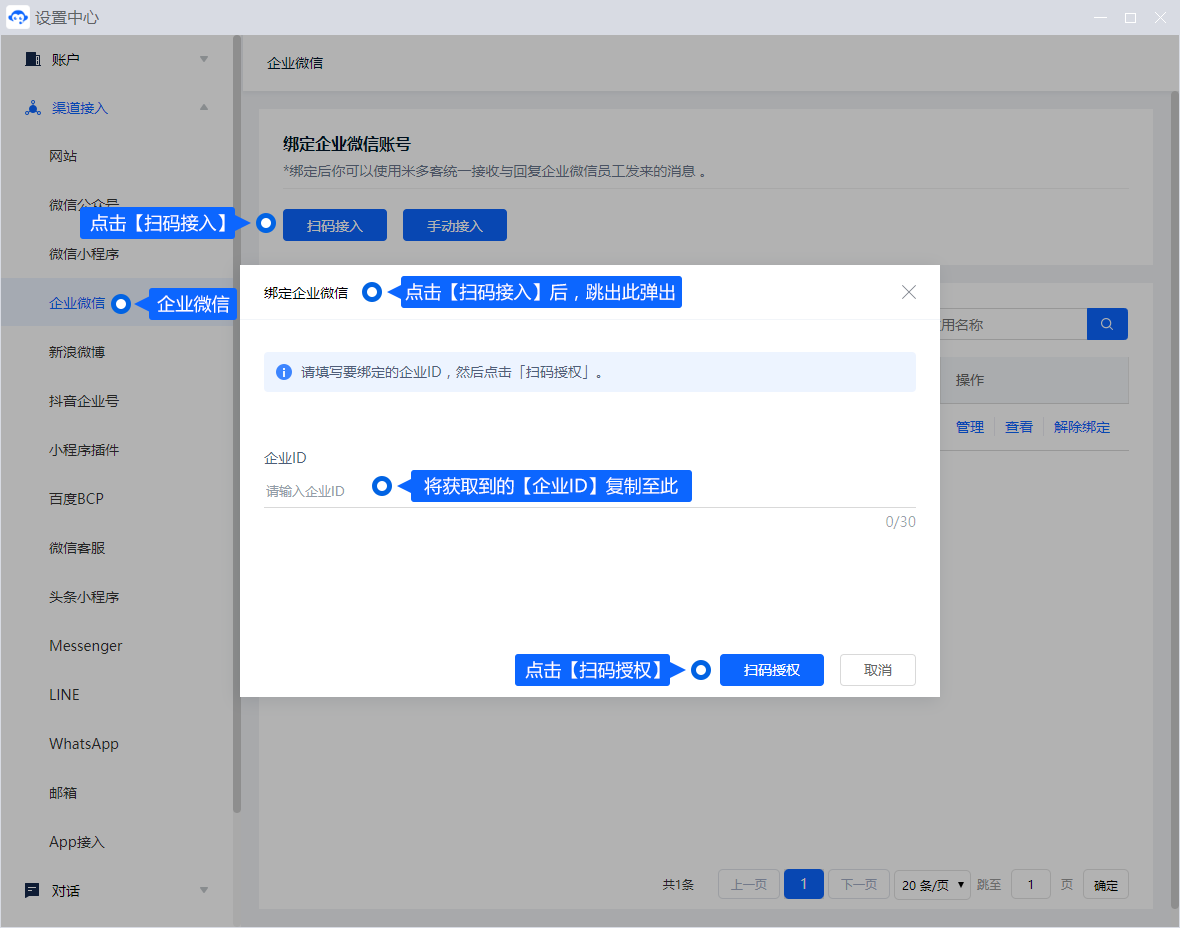 回到米多客,在「设置中心 - 渠道接入 - 企业微信」页面中,点击【扫码接入】按钮,并在弹出的页面中找到企业ID,将获取到的企业ID信息复制至此,并点击【扫码授权】按钮。