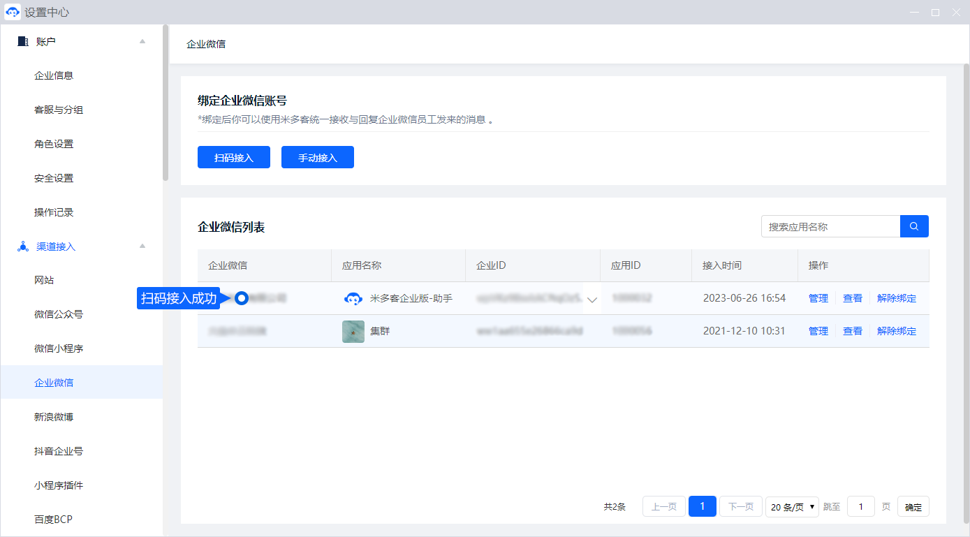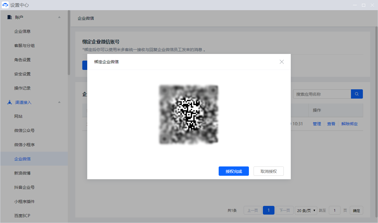 最后,联系米多客官方客服进行最终企业微信绑定操作,至此扫码接入完成。