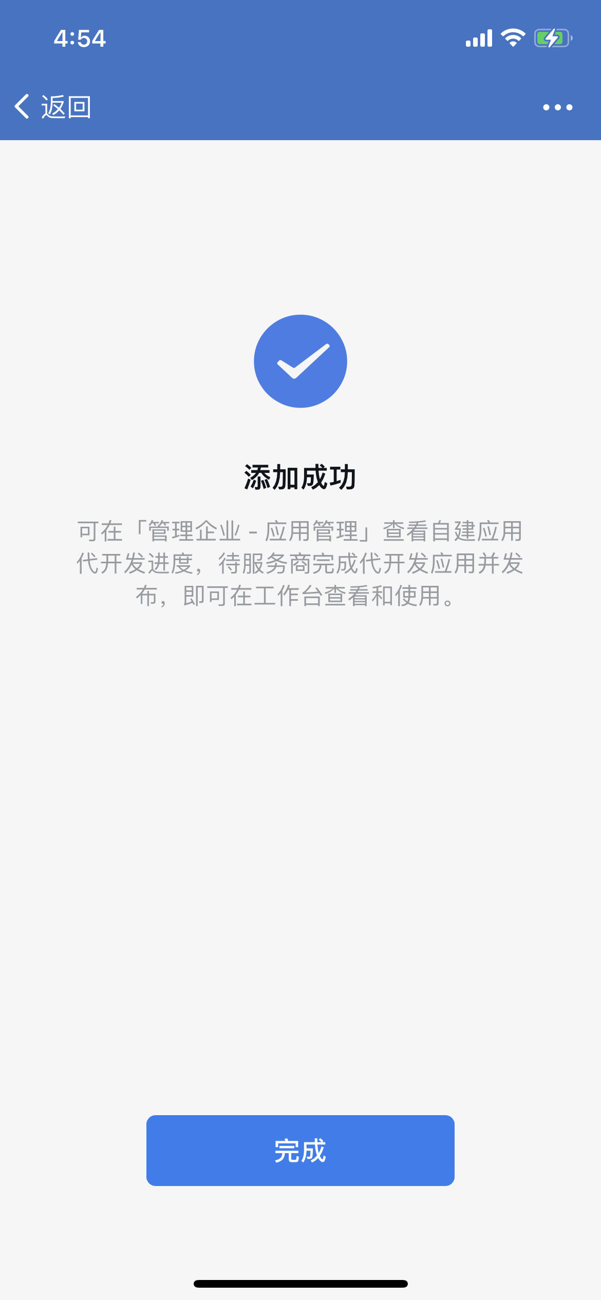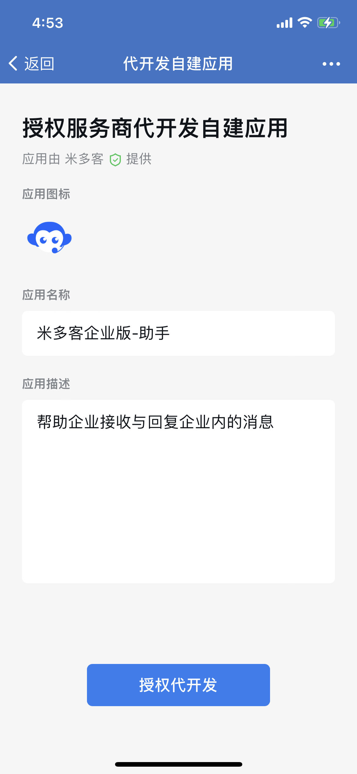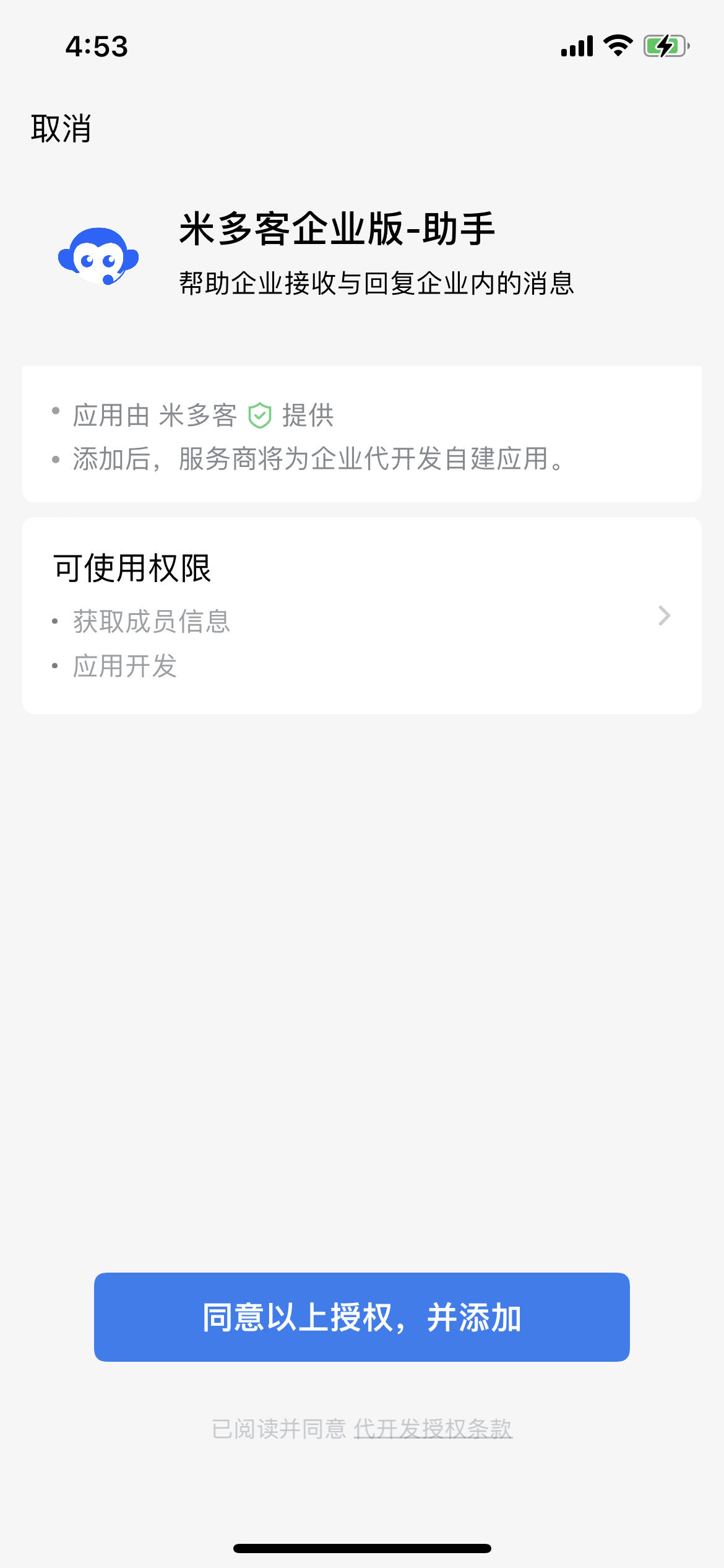 使用企业微信扫码弹出的二维码,并依次点击按钮【授权代开发】、【同意以上授权,并添加】、【完成】。