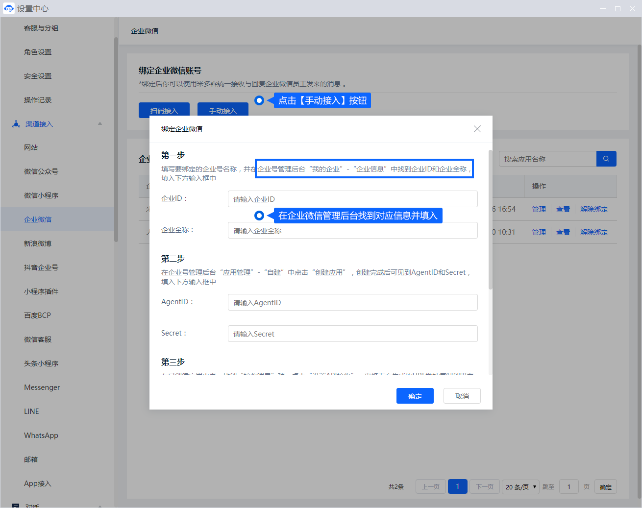 绑定企业微信后,企业可以使用米多客统一接收与回复企业微信员工发来的消息 。绑定方式分为两种:扫码接入、手动接入。