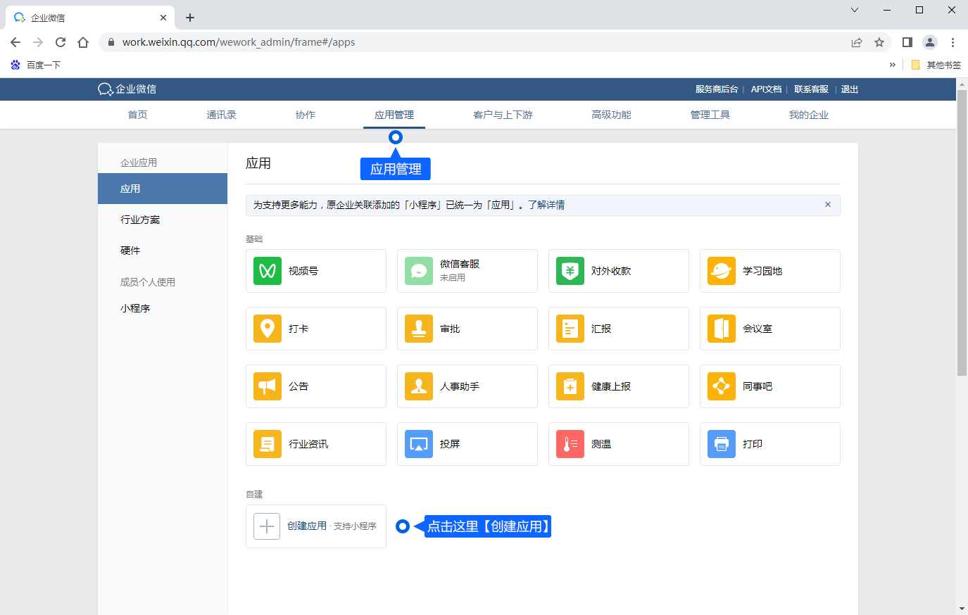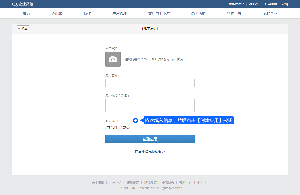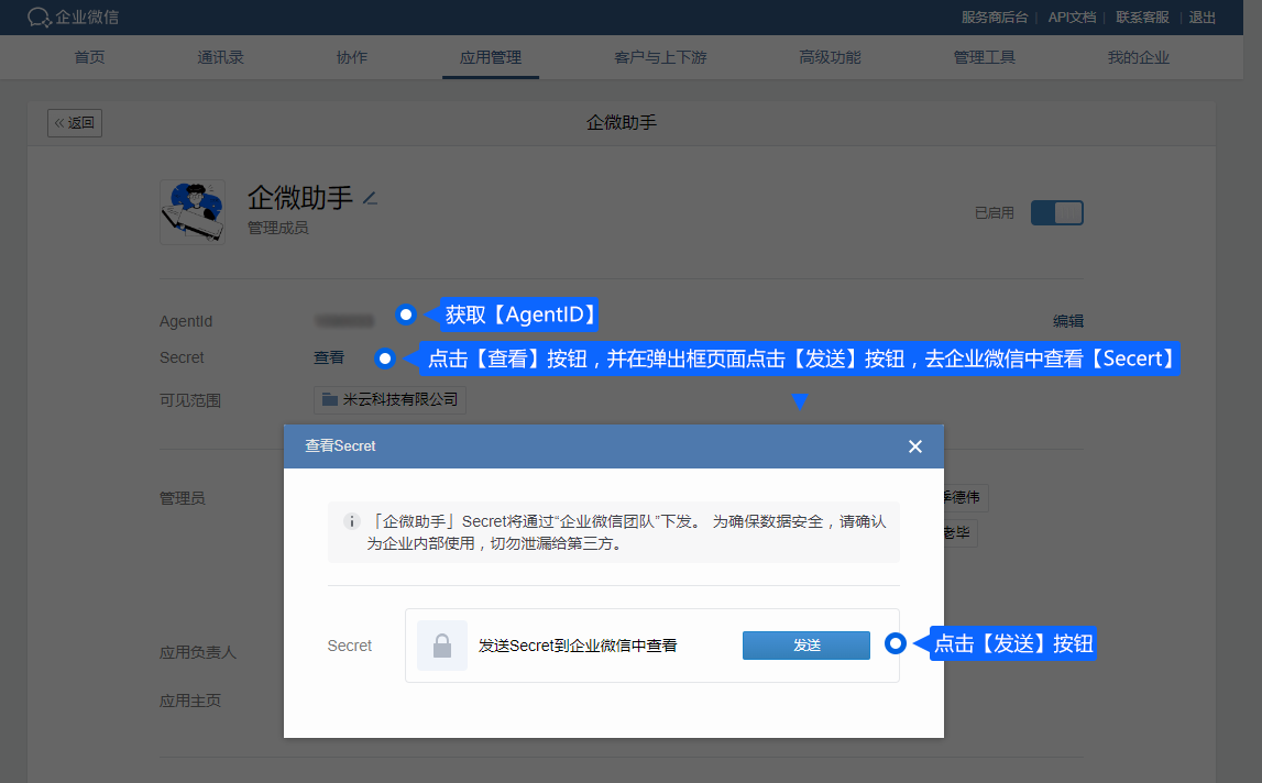 第二步:在企业微信管理后台「应用管理 - 自建」中点击【创建应用】,创建完成后可见到AgentID和Secret,填入米多客【绑定企业微信】第二步输入框中。