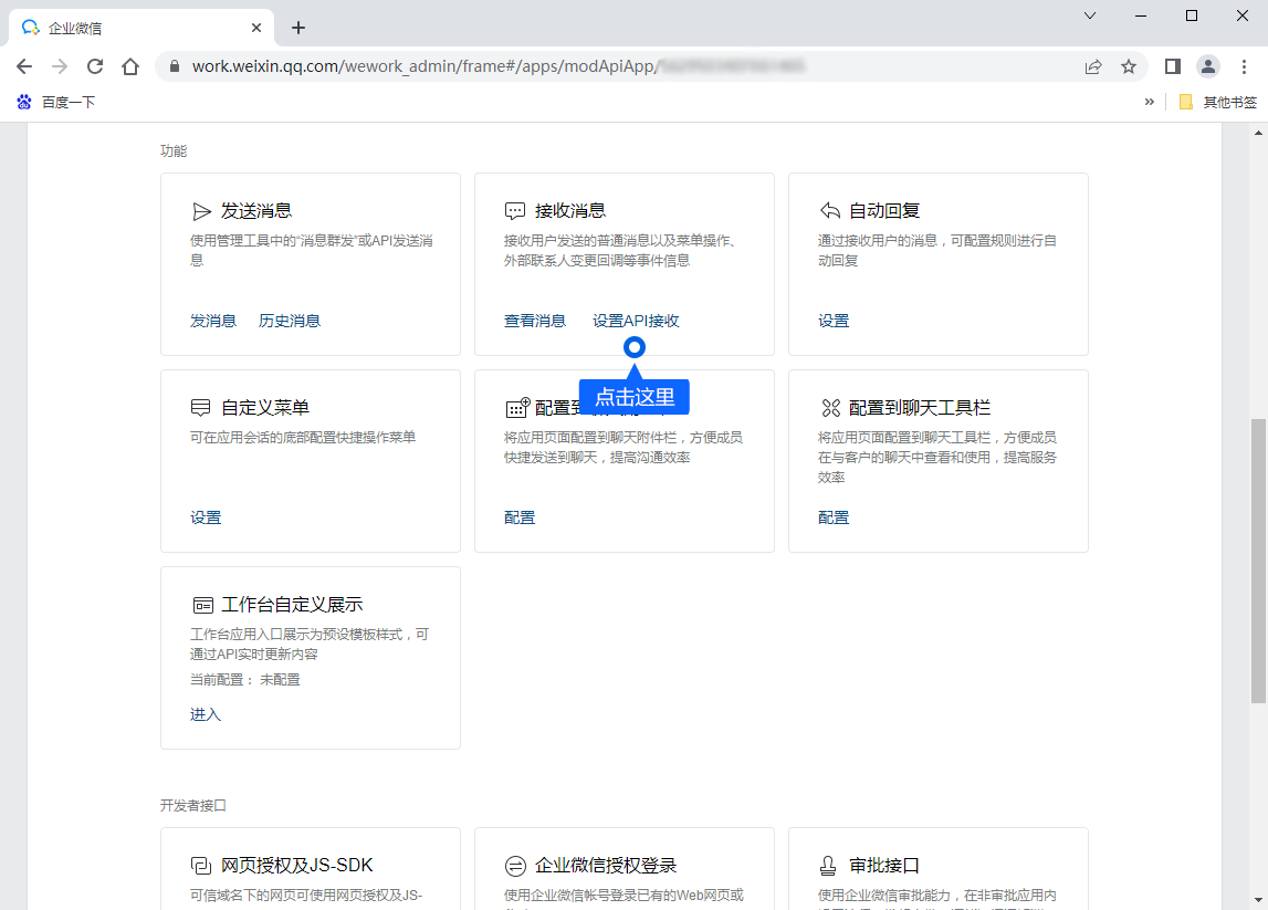 第三步:在已创建应用内页,找到“接收消息”项,点击“设置API接收”,再将米多客【绑定企业微信】第三步生成的URL地址复制到里面。
