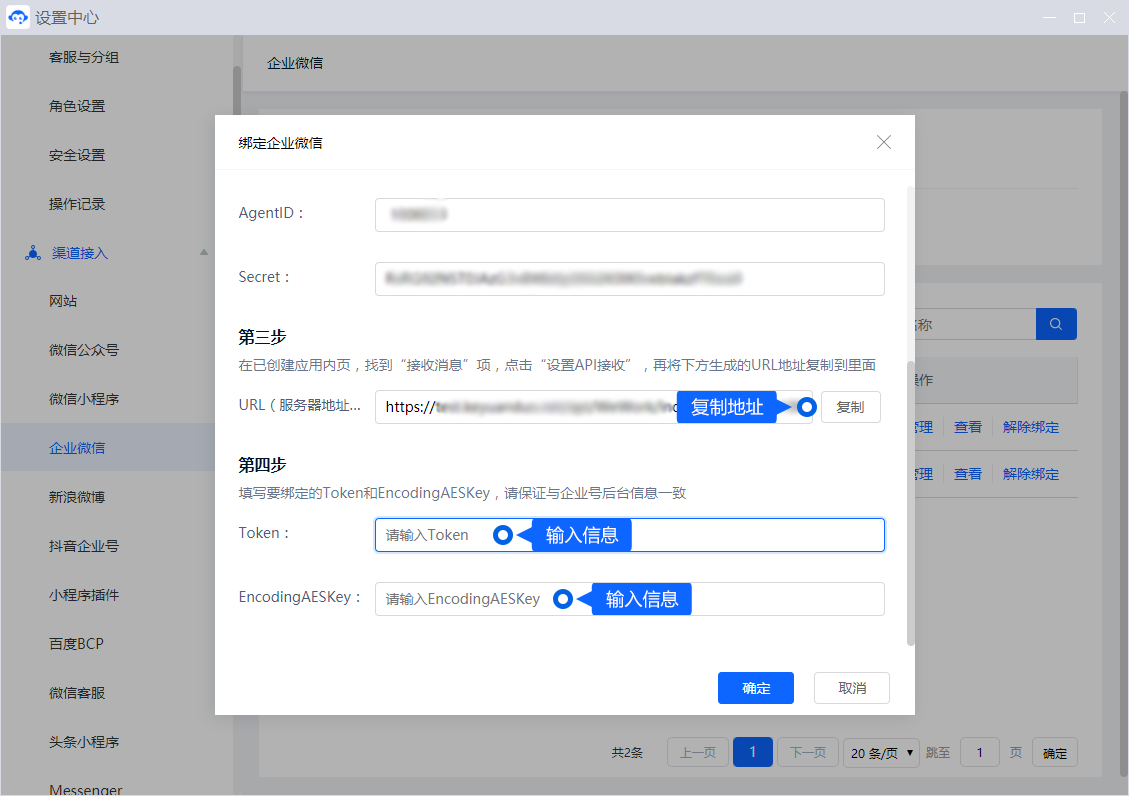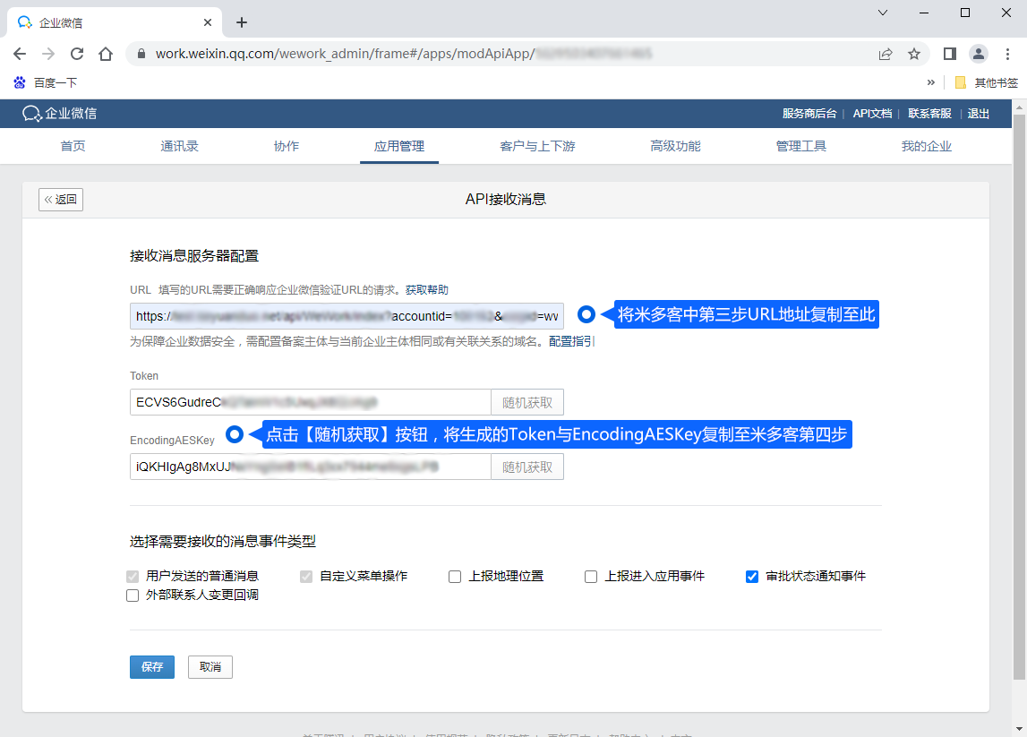 第四步:将企业微信随机获取到的Token和EncodingAESKey,填写到米多客【绑定企业微信】第四步输入框中。